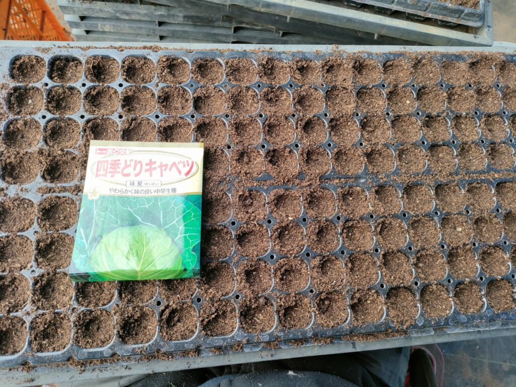 今日はキャベツセルトレー128穴 × 2に播種しました。