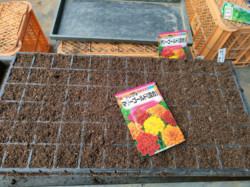 まずはマリーゴールドを播種しました。